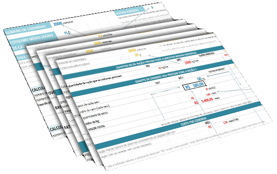 Você não precisará quebrar a cabeça na contabilidade. Receba de bônus planilhas encadeadas que facilitarão os cálculos dando visão geral de investimentos necessários e projeção de lucro. É só inserir os valores e todos os cálculos são feitos automaticamente. Isso permite que você monte um plano e se planeje em pouco tempo.